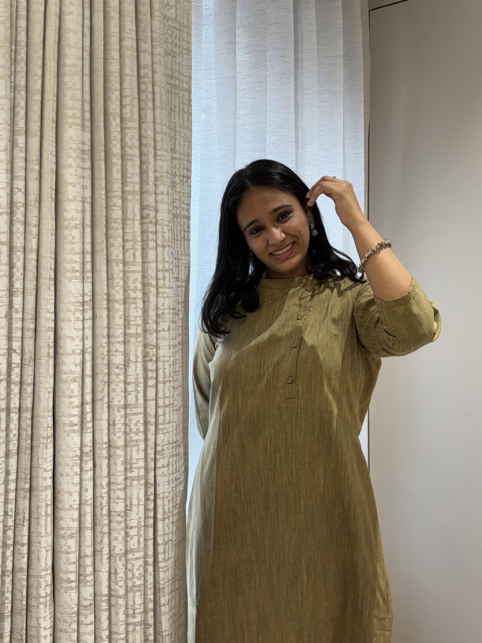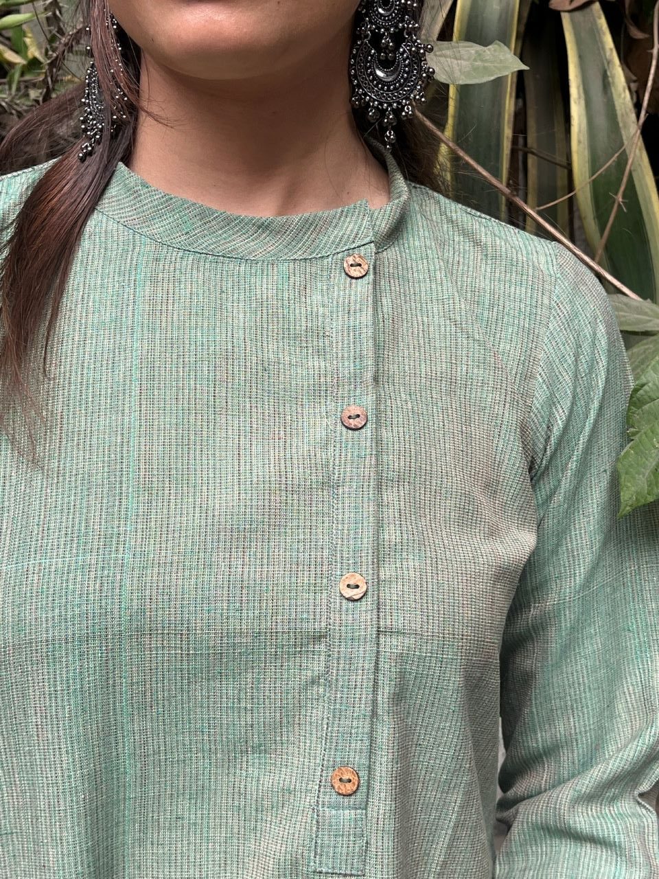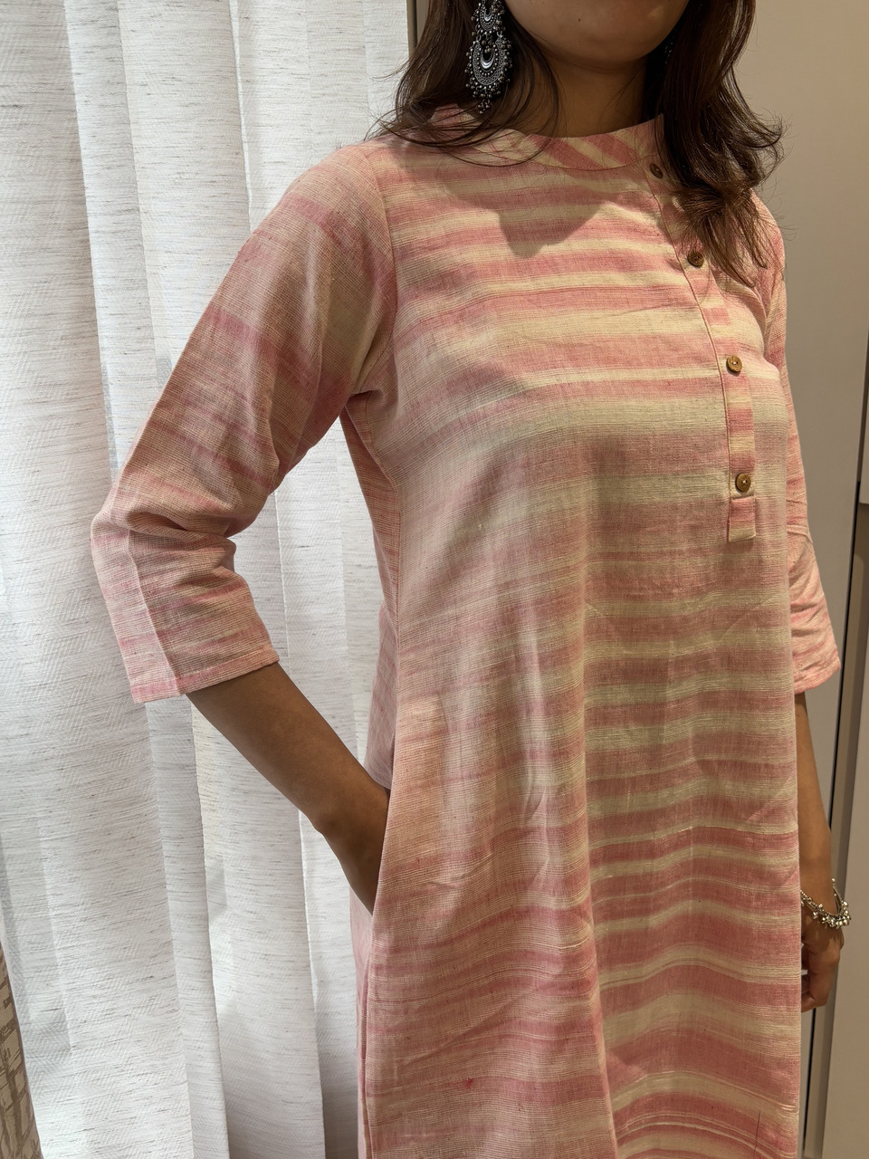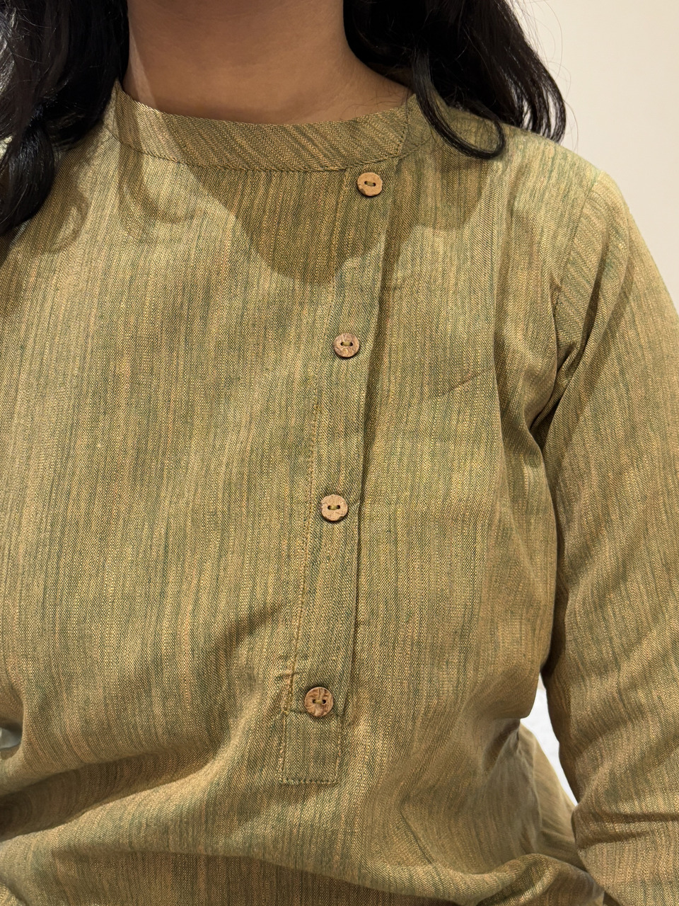 Introducing Ritvi-The Art of Handwoven Beauty. Pure, Ethereal Ritvi, our latest Khadi Collection, where tradition meets contemporary grace. Designed for the modern woman who cherishes heritage, Ritvi blends earthy elegance with a relaxed silhouette. Experience the perfect harmony of elegance and ease with the Ritvi Dress – a masterpiece of artisanal craftsmanship. Designed to flatter, it features a closed neck with a delicate false button opening, chic 3/4th sleeves, and a graceful A-line silhouette that falls beautifully to calf length.