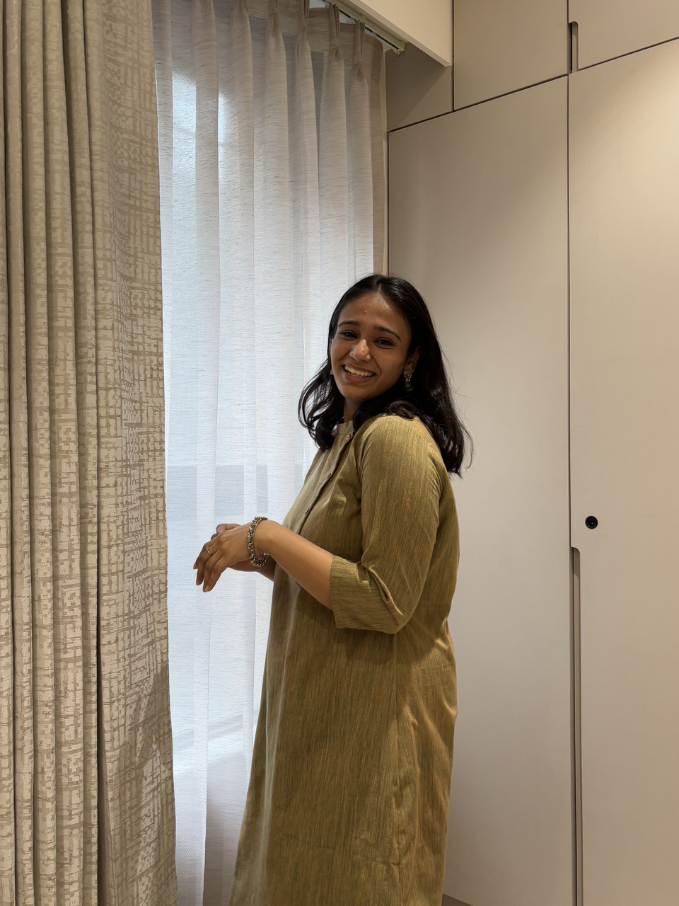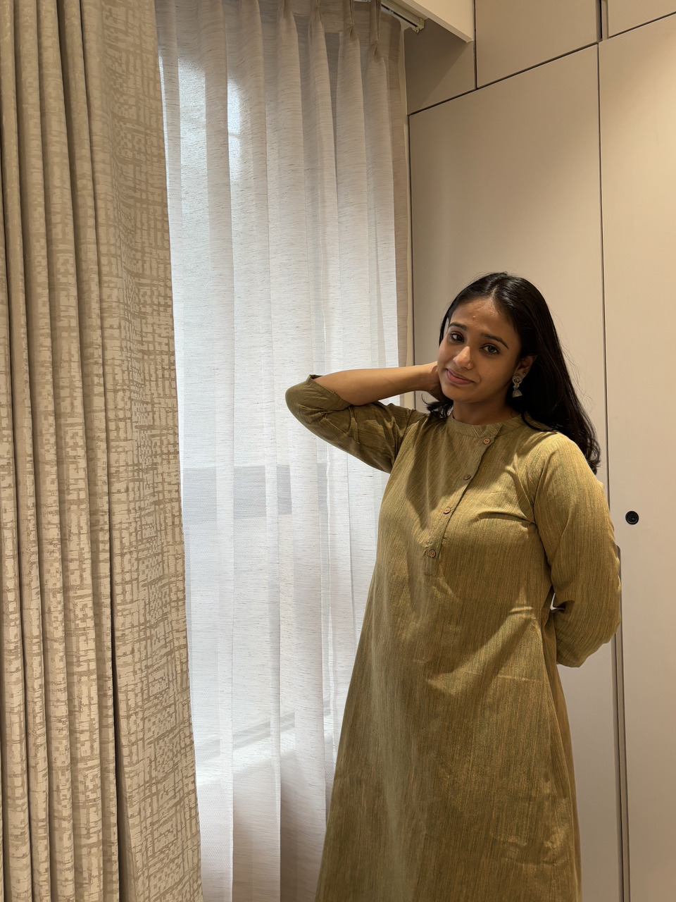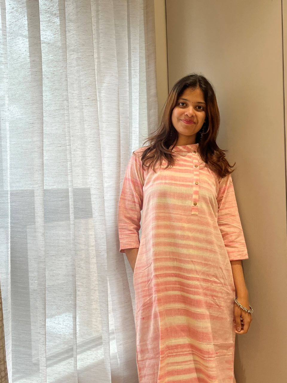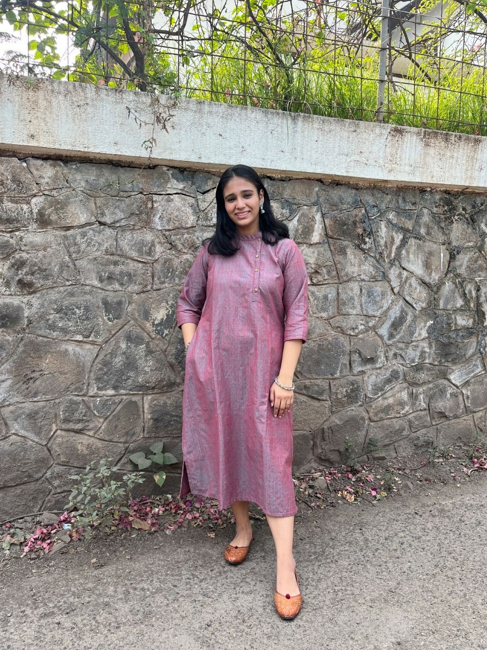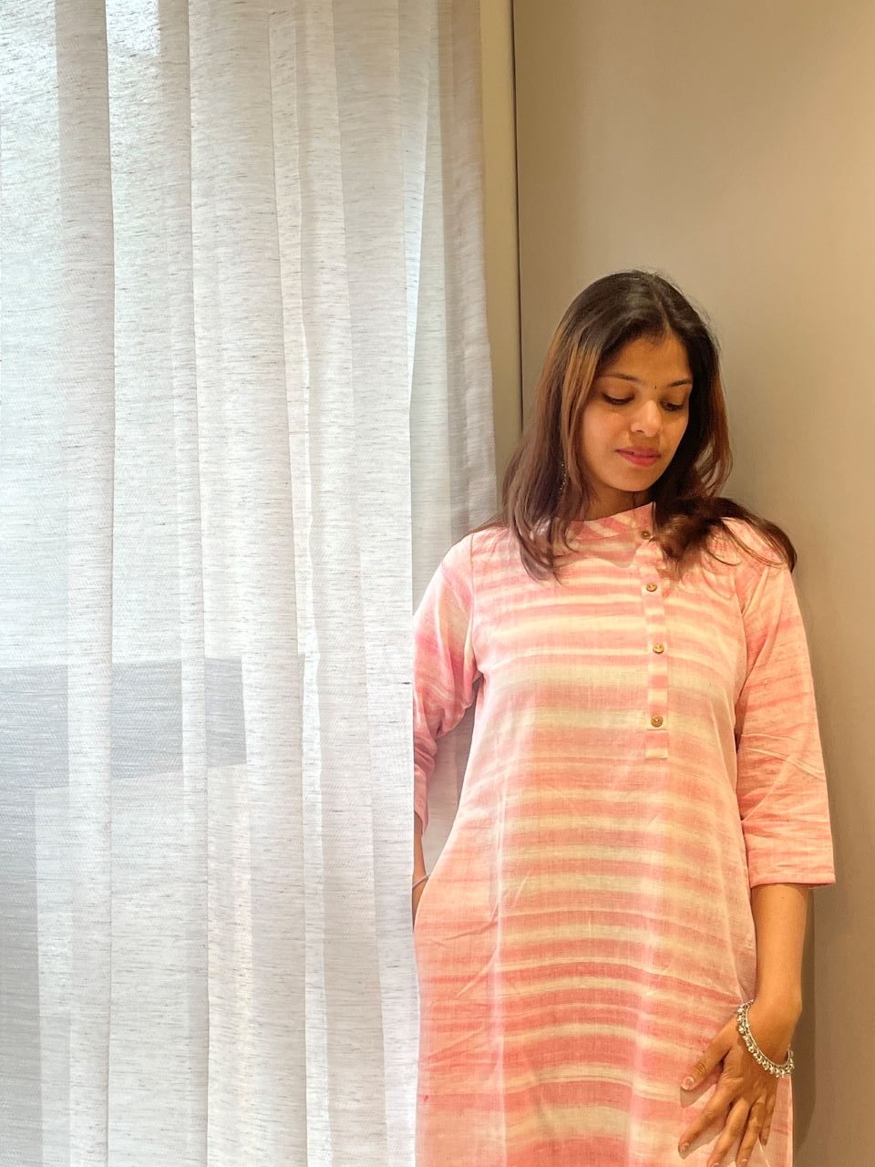 Introducing Ritvi-The Art of Handwoven Beauty. Pure, Ethereal Ritvi, our latest Khadi Collection, where tradition meets contemporary grace. Designed for the modern woman who cherishes heritage, Ritvi blends earthy elegance with a relaxed silhouette. Experience the perfect harmony of elegance and ease with the Ritvi Dress – a masterpiece of artisanal craftsmanship. Designed to flatter, it features a closed neck with a delicate false button opening, chic 3/4th sleeves, and a graceful A-line silhouette that falls beautifully to calf length.